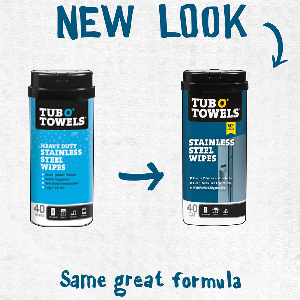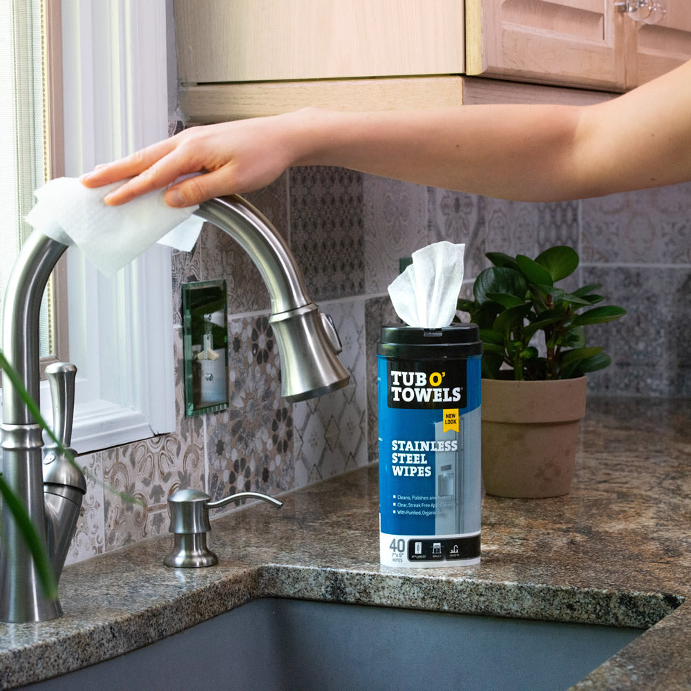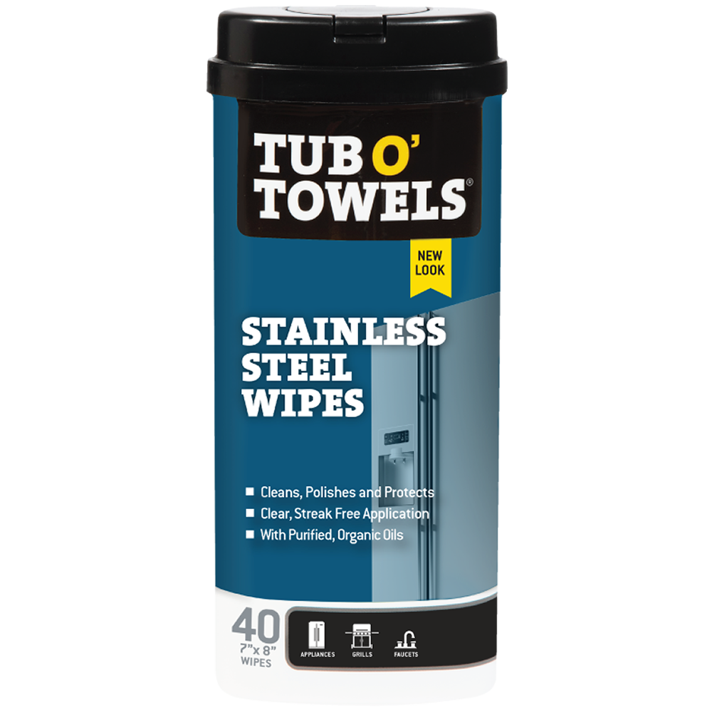 Tub O’ Towels Stainless Steel Wipes remove fingerprints, water marks, greasy stains, and soil while leaving a brilliant, streak-free shine. These stainless steel cleaning wipes will work wonders in your kitchen. Use them on your stainless steel dishwasher, range, refrigerator doors, stove top, toaster, faucet, sink and any other stainless steel appliance or surface. Great for cleaning your stainless steel grill too!